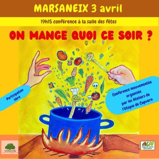 Vendredi 3 AVRIL à 19h15 on vous propose une conférence mouvementée « On mange quoi ce soir ? » de Utopie Capvern avec débat et partage de la soupe cuisinée sur place.