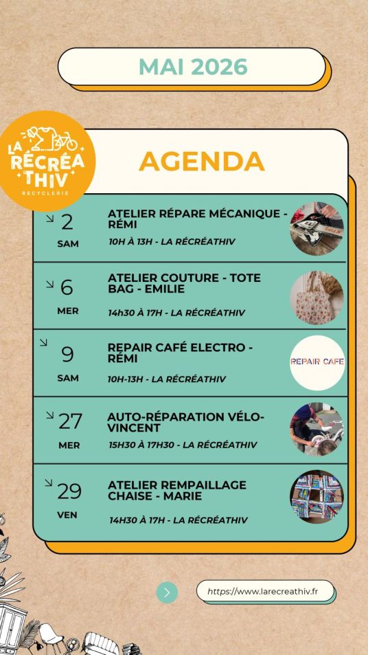 Vous trouverez le programme de mai qui comprend un atelier mécanique, un sur la réparation d'objets électroniques, un atelier répar'vélo, un atelier de rempaillage de chaises, ainsi qu'un atelier de couture pour fabriquer des tote bag.