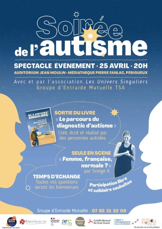 L’association Les Univers Singuliers du GEM TSA de Périgueux organise la Soirée de l'Autisme à Périgueux le 25 avril 2026 à l’auditorium Jean Moulin de la bibliothèque Fanlac à Périgueux.